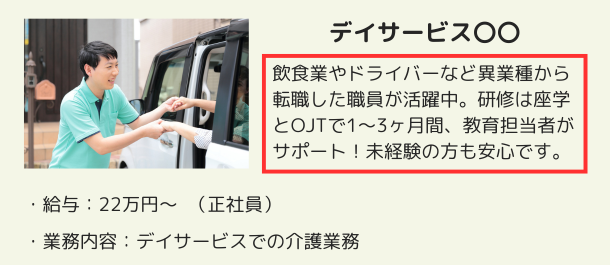 転職するメリットと働くイメージが想像できると応募意欲がアップします。ポイントはできるだけ具体的にすることです。例えば「雰囲気が良い職場です」ではなく、「"職員同士で協力しあうこと"を大切にしているため、一人ひとりの事情や意見が尊重され、安心して働ける職場です」の方が雰囲気をイメージしやすくなります。また数字で示すと説得力が増し、魅力が伝わりやすくなります。