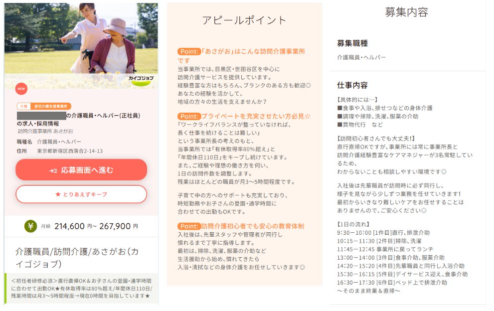 | 【作成時のポイント】 ・給与欄の上部には基本給と一律手当を合算した金額を記載 ・未経験・無資格の求職者への訴求のため、仕事内容に1日の流れを記載 ・介護職に初めて挑戦する方の不安を払拭するために「まずは利用者さまの名前を覚えることから始めましょう」や「先輩スタッフがマンツーマンで指導するので基礎からしっかり学べます」など、サポート体制をアピール |