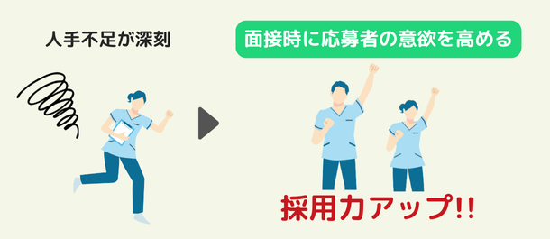 売り手市場が続いている状況の中、面接は応募者が自社に相応しいか見極め・選ぶ場であると同時に、応募者から「選んでもらう場」であることも意識しましょう。面接で志望度を高めることで、同時に選考を受けている競合他社と差別化でき、貴重な人材を採用できる確率が高まります。