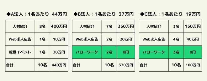 単価の高い人材紹介の採用人数を減らし、ハローワークの採用を取り入れると1名あたりの採用費用を下げられます。採用が難しい職種やポジションの人材に絞って人材紹介を利用するなど、採用したい人材に適した採用手法を使い分けましょう。