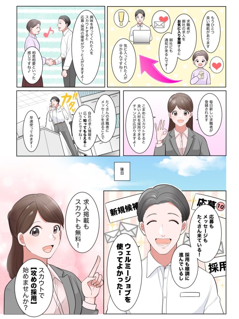 ウェルミージョブ(旧カイゴジョブ)に求人広告を掲載すると求職者をスカウトして、応募を促進することができます。「どのような機能かイメージがつかない」「使い方が難しそう」と思っていませんか? スカウトの使い方や効果をマンガでご紹介します。